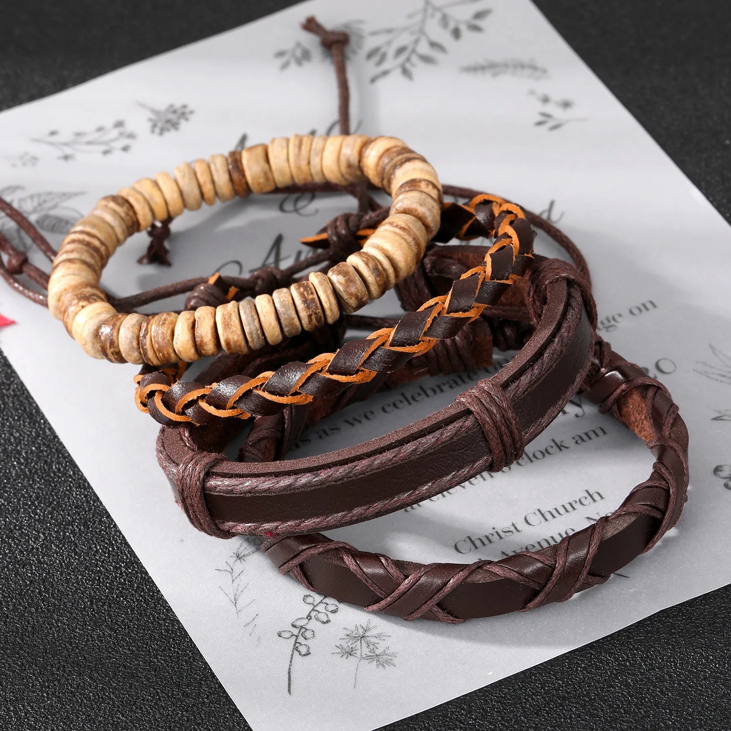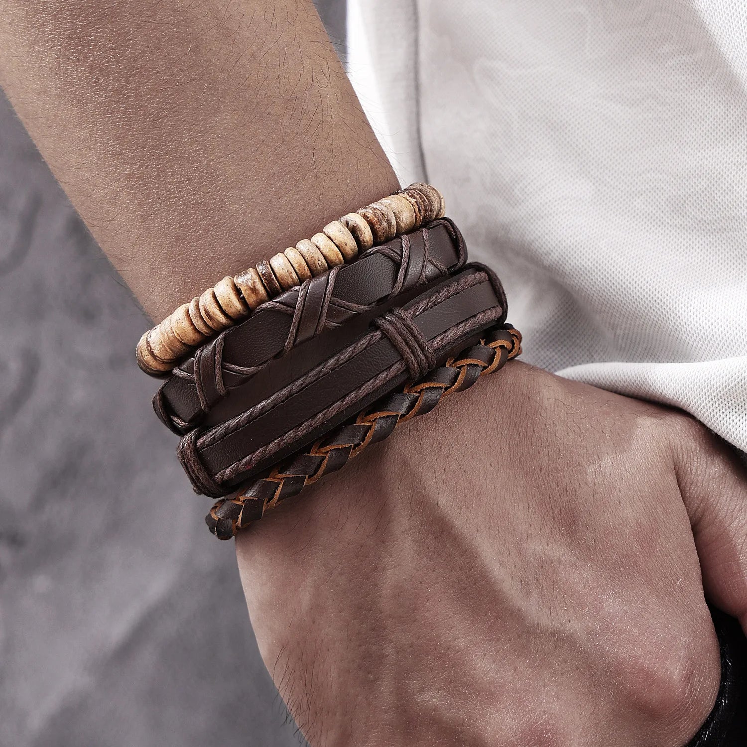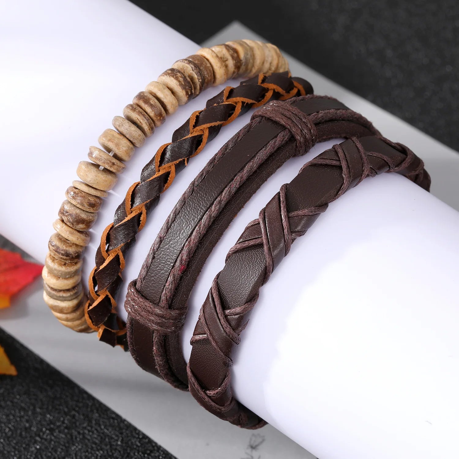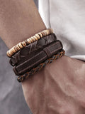 Retro Hand-woven Wood Beads Multi-layer Bracelets Hip Hop Leather Coconut Shell Men Bracelets Fashion Jewelry Trendy Accessories