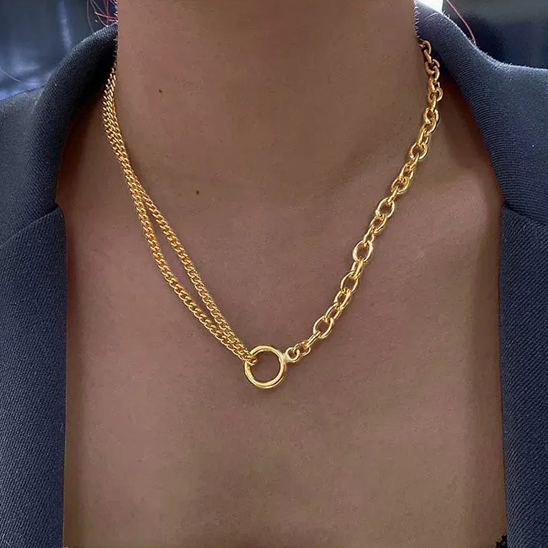 Oval Cable Link With Double Cuban Chain Necklace Women, Stainless Steel Fashion Mix Open Circle Pendant Statement Jewelry