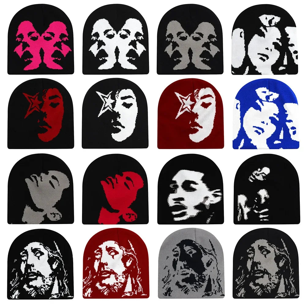 2024 Fashion Face Pattern Beanies Hip Hop Y2K Street Hat Women Men Dance Fire Hell Burn Winter Warm Knitted Bonnet Skiing Hat