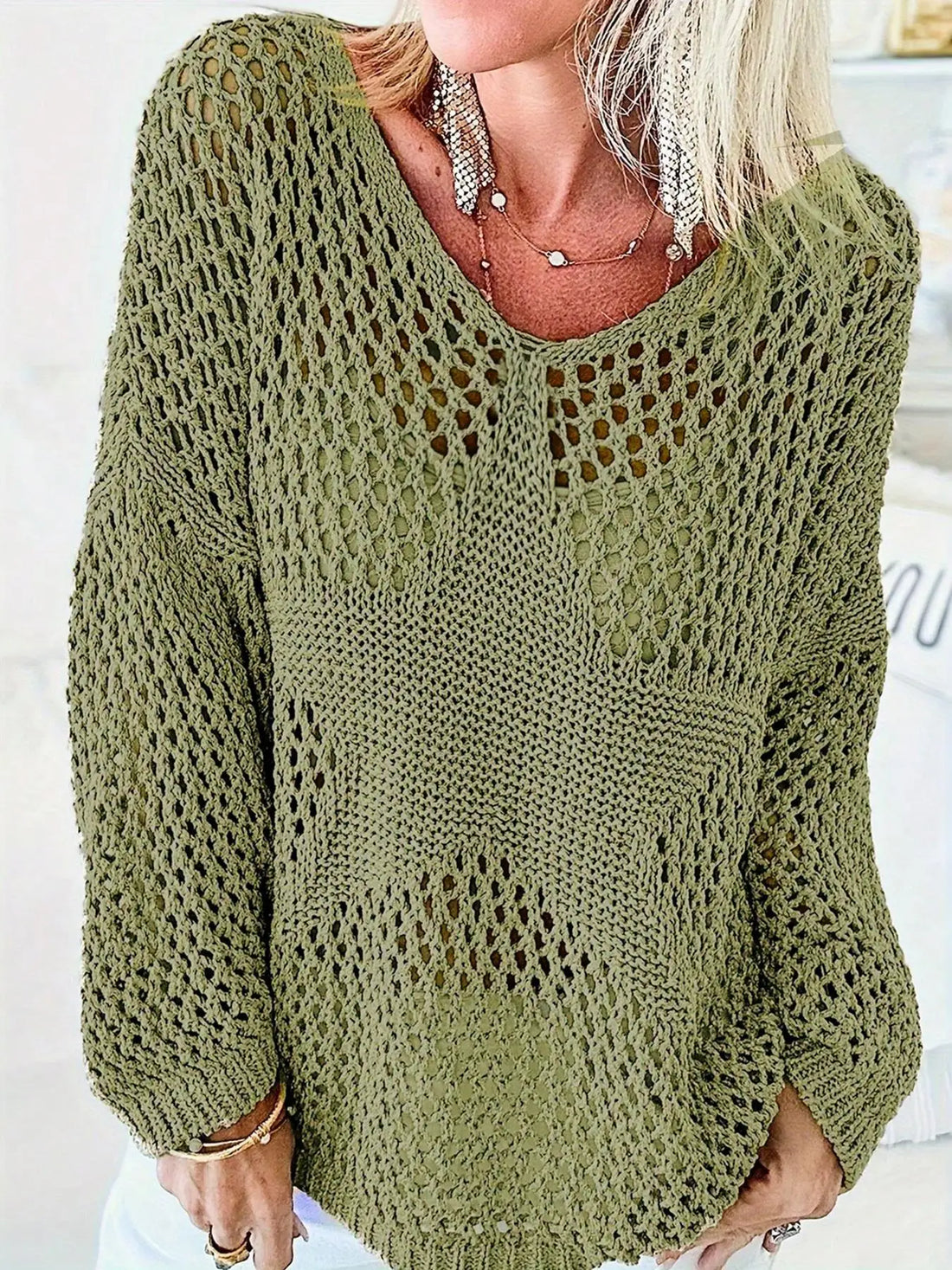 Women's casual round neck solid color hollow star jacquard semi transparent loose and versatile woolen pullover top
