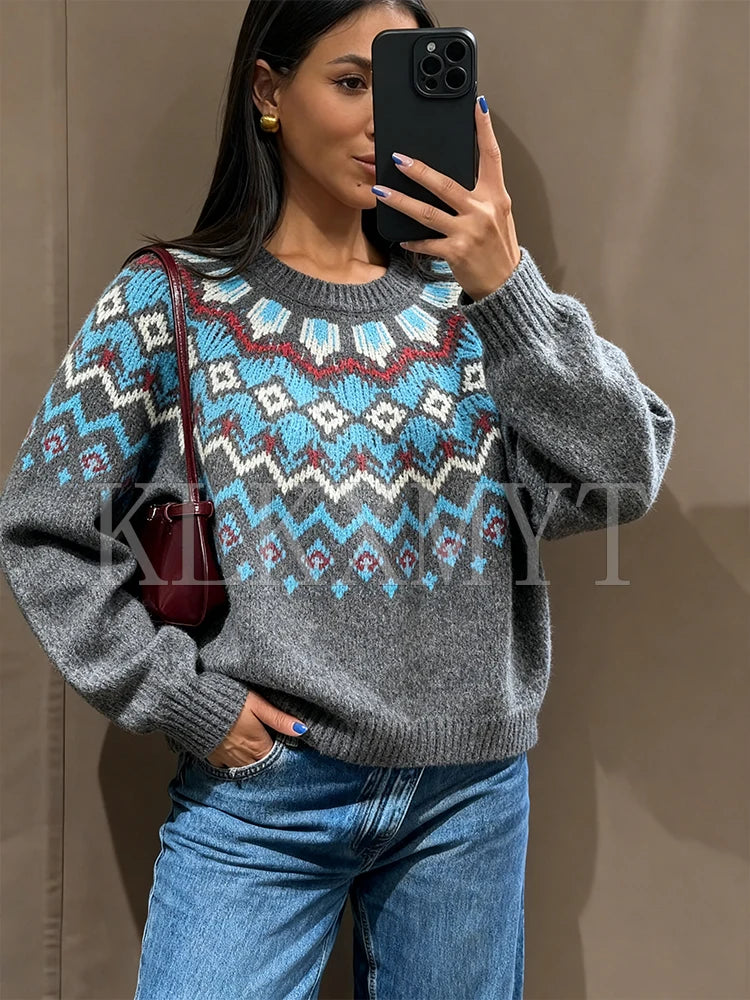 Women's Knitted Pullover Women Fashion Long Sleeve Vintage Jacquard Sweater 2025 New Casual Loose Knitwear Tops