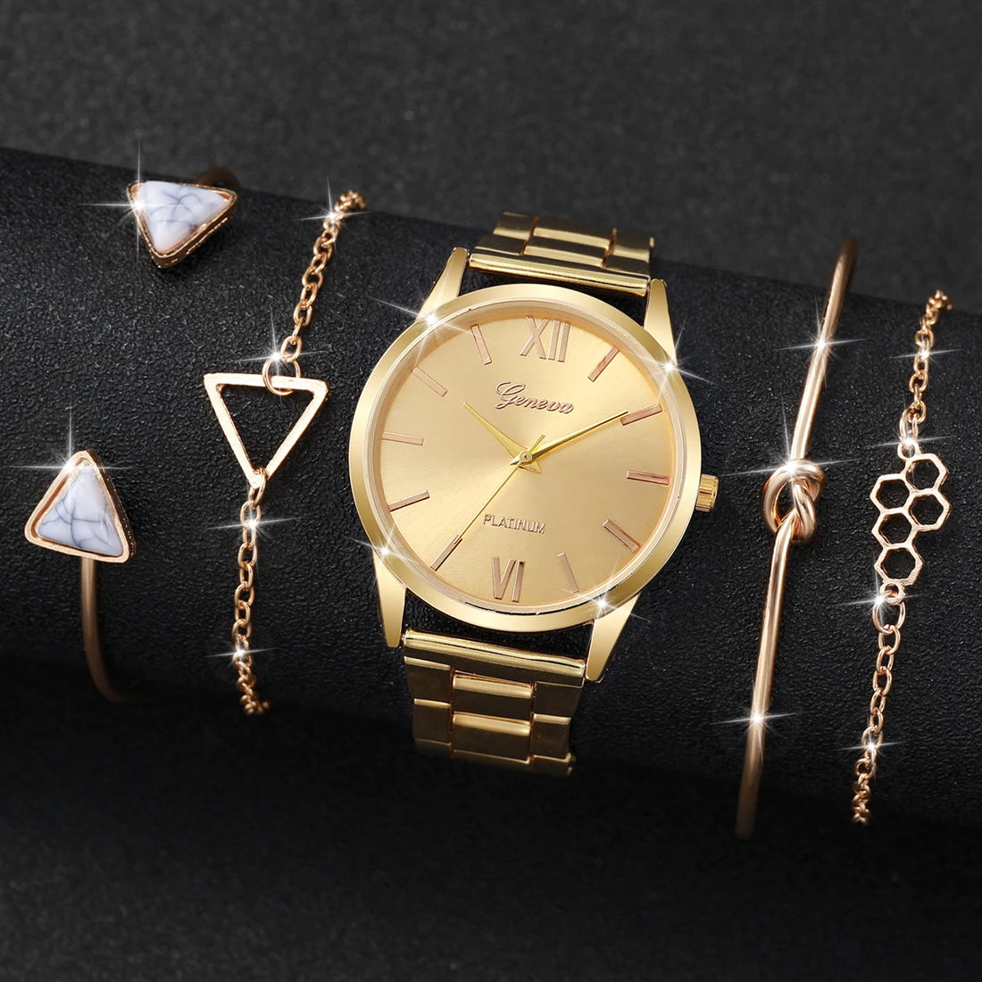 5PCS/Set Fashion Roma Dial Women's Watch Gold Steel Band Female Quartz Watches Bracelets Set