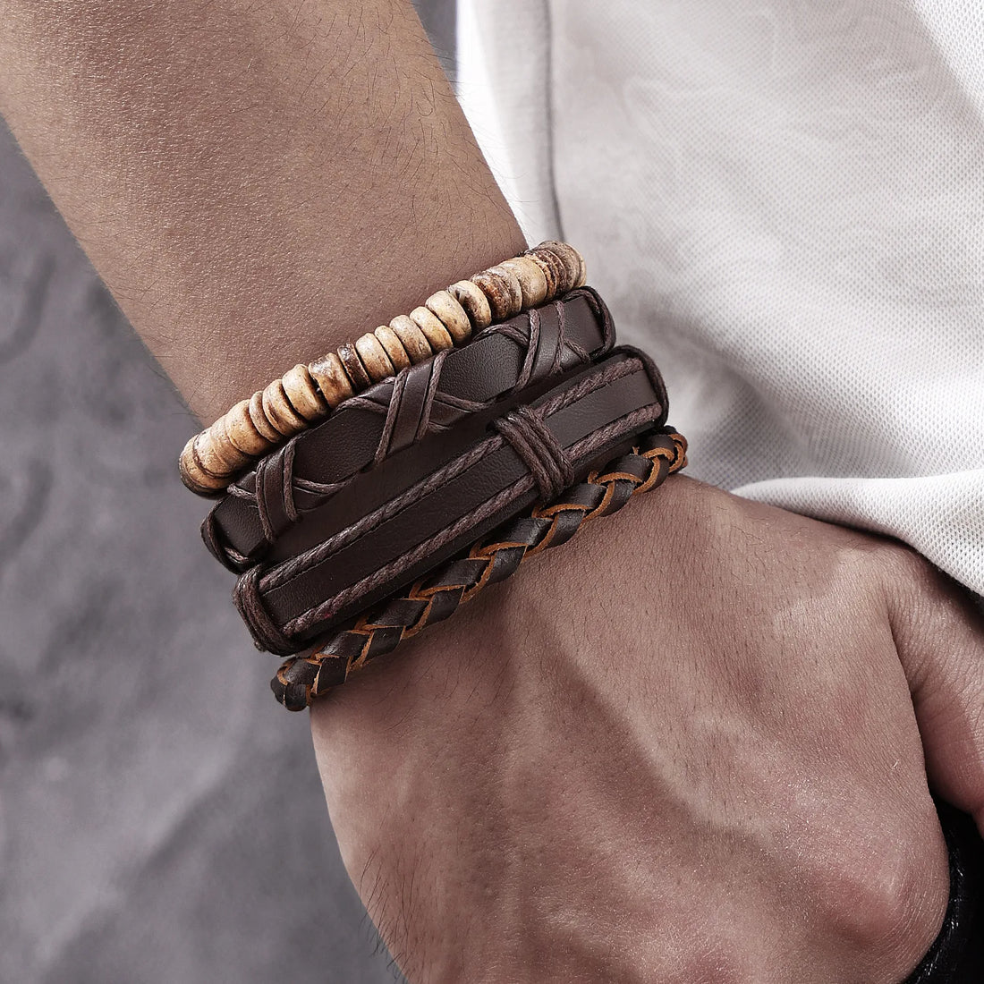 Retro Alloy Shell Multilayer Wood Beads Handmade Weaving Leather Bracelet Bohemian Men Bracelet Set Hip Hop Jewelry Accessories