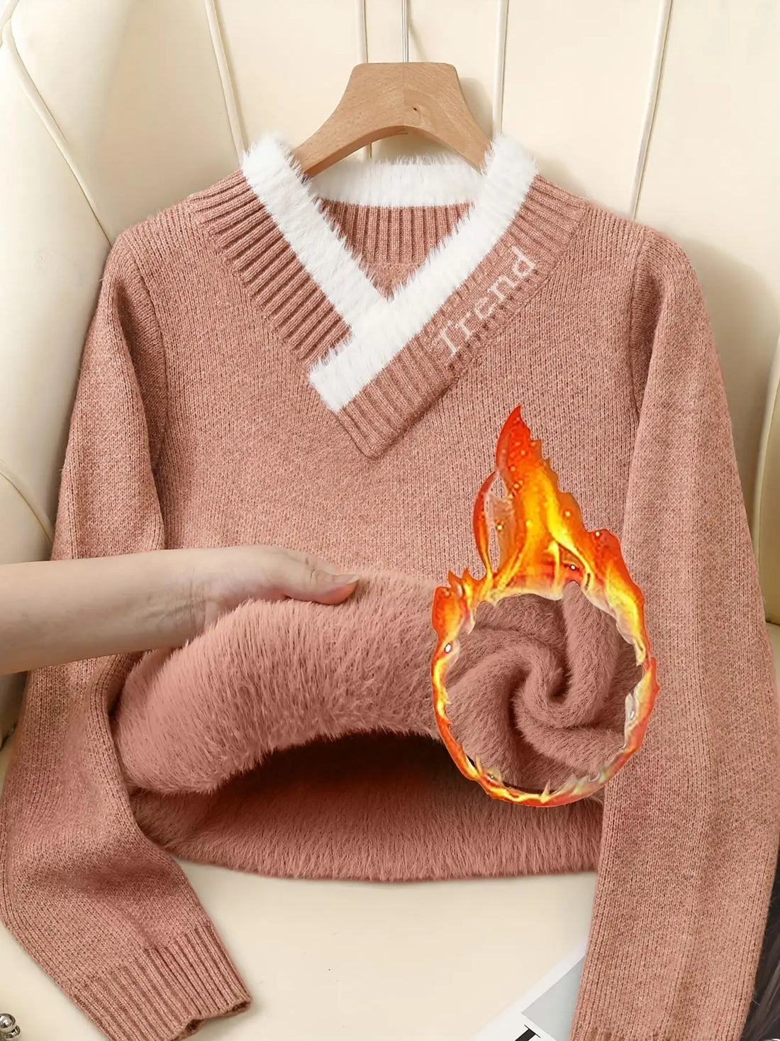 Autumn and winter women's V-neck contrasting splicing with thick velvet for warmth and versatile woolen pullover top