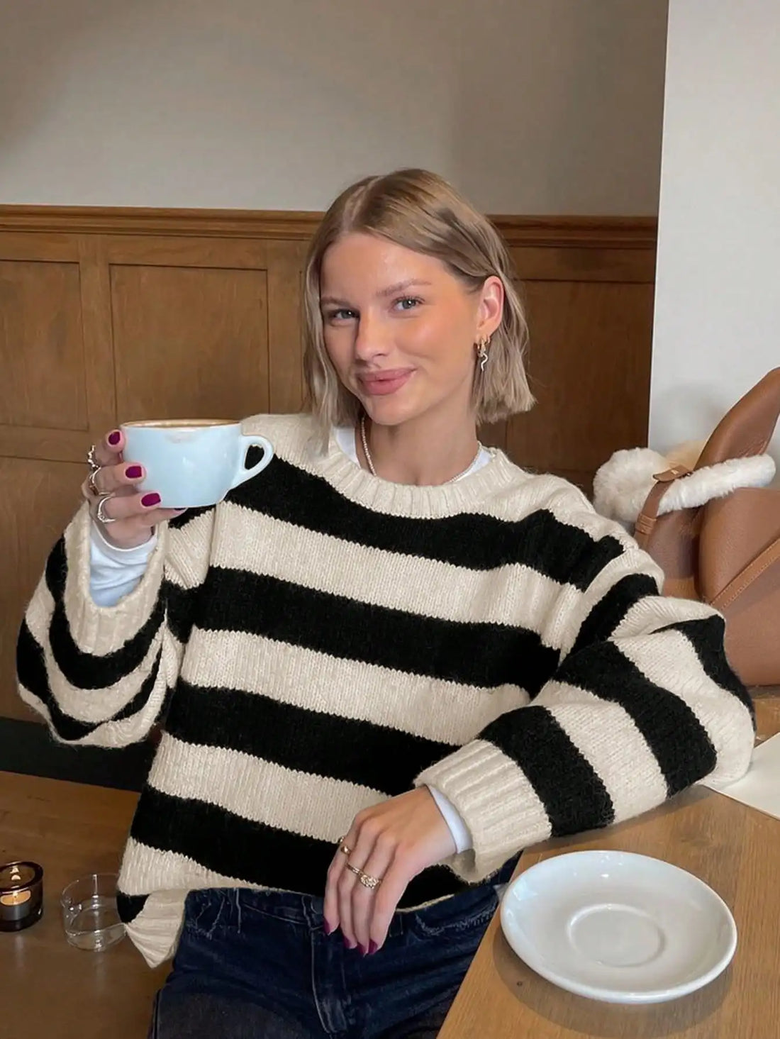 Autumn and winter women's round neck striped contrasting loose casual woolen pullover top