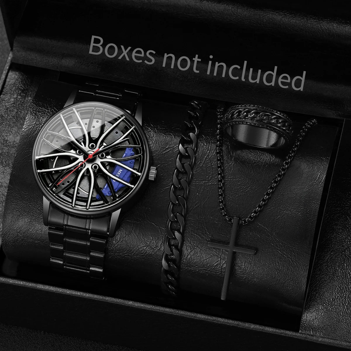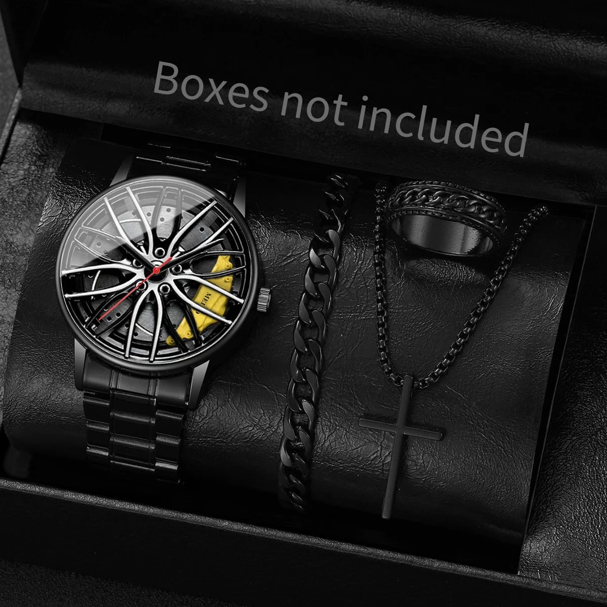 4PCS/Set Fashion 3D Car Wheel Dial Men Sports Watch Luxury Steel Band Quartz Wristwatches Jewelry Set Reloj Hombre(Without Box)