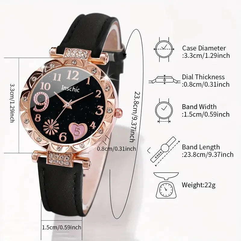 6PCS/Set Women's Watches Fashion Rhinestone Heart Dial Leather Band Quartz Watch Leaf Bracelets Set(Without Box)