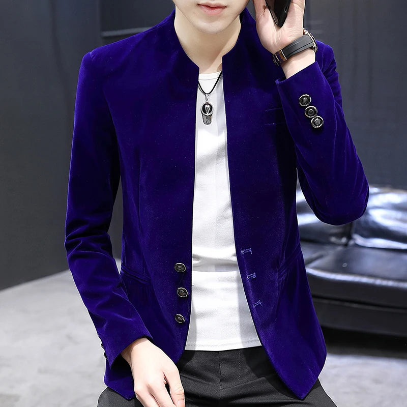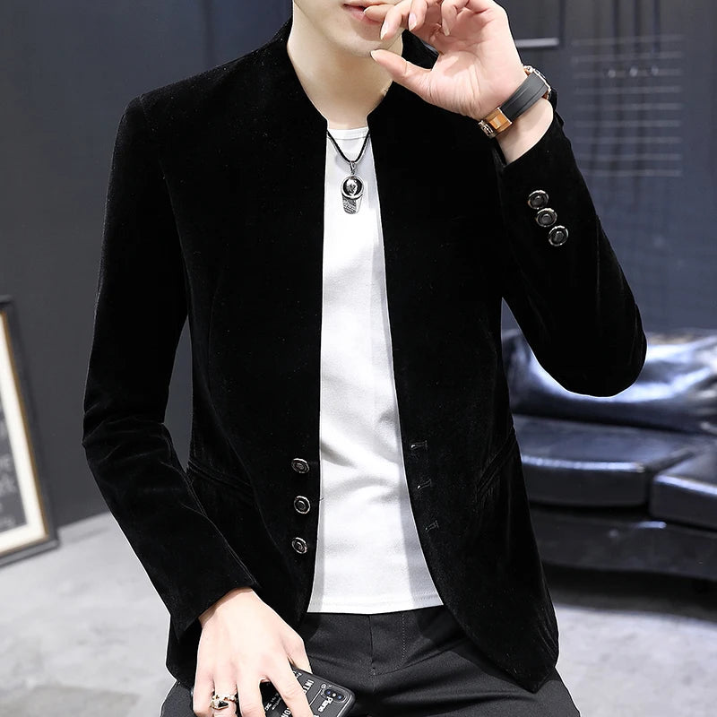 2025 Men's Casual Business Velvet Suit Jacket High-Quality Fashionable Stylish Versatile Solid-Color Craft Stand-Up Collar