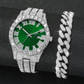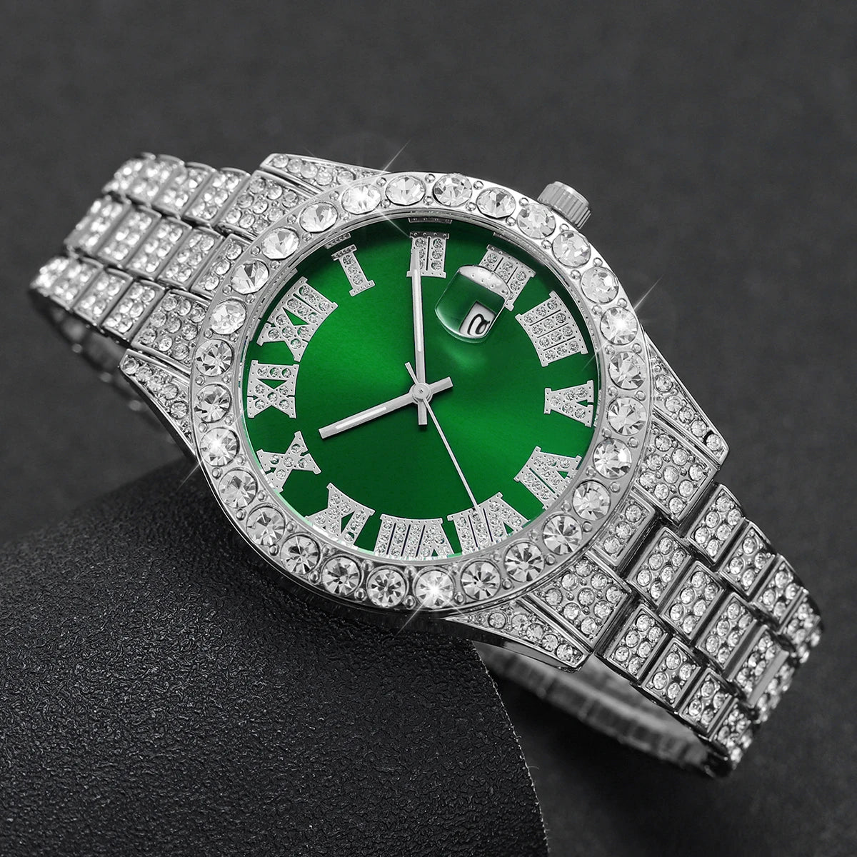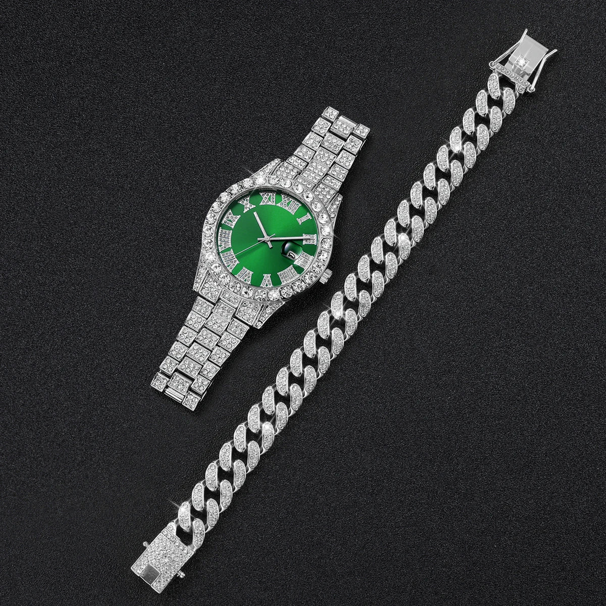 2PCS/Set Men's Watch Fashion Full Diamond Roma Dial Steel Band Quartz Watches Rhinestone Bracelet Set(Without Box)