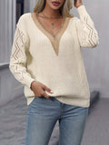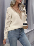 Solid V Neck Cut Out Drop Shoulder Sweater  Casual Long Sleeve Sweater For Spring & Winter  Women's Clothing