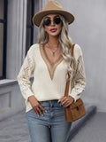 Solid V Neck Cut Out Drop Shoulder Sweater Casual Long Sleeve Sweater For Spring & Winter Women's Clothing