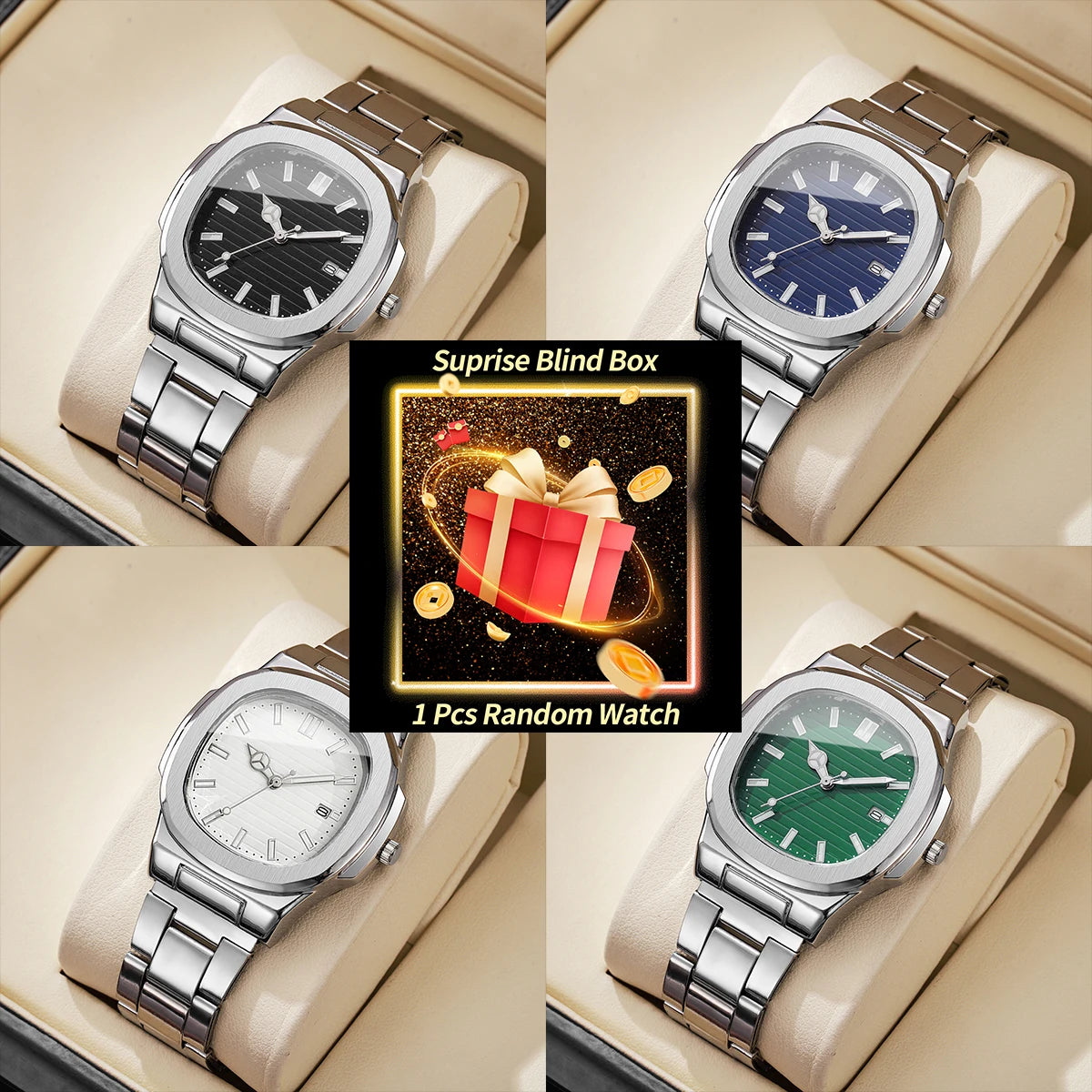 1PC Surprise Watch Mystery Box-Fashion Square Men Business Watches Stainless Steel Calendar Quartz Watch (Without Box)