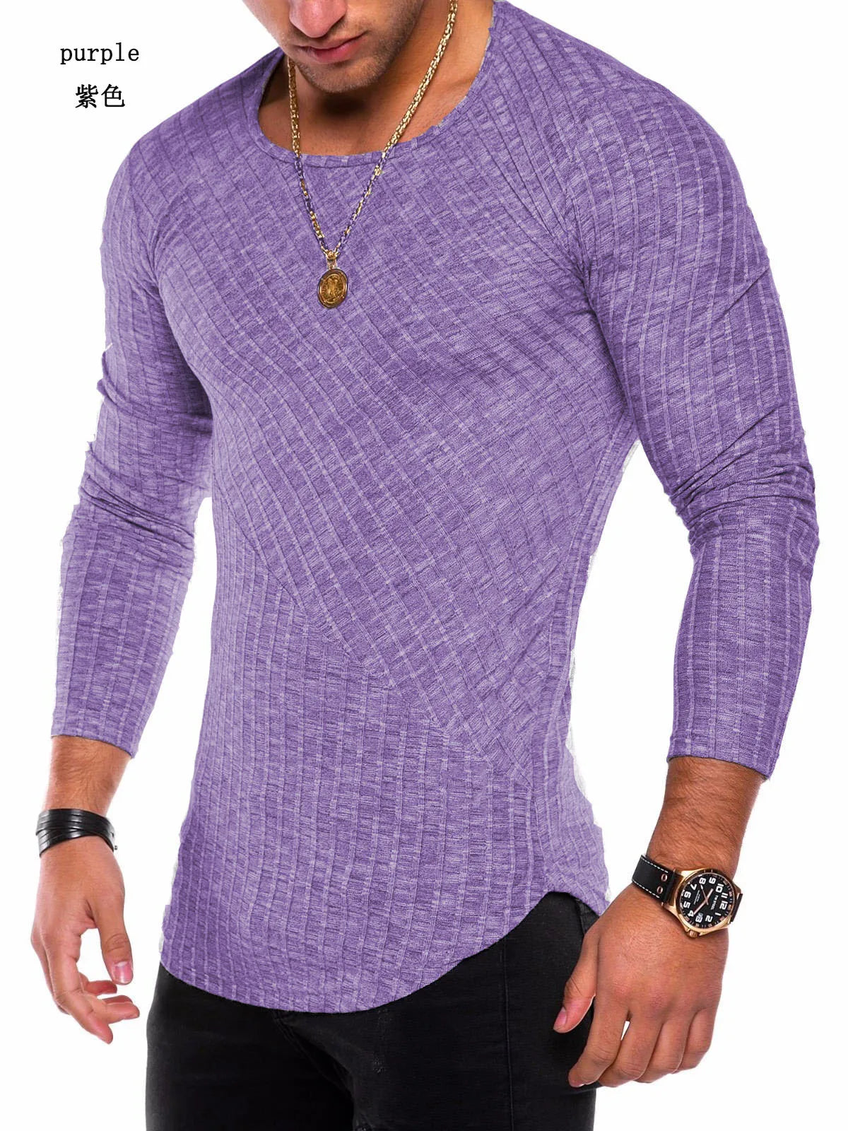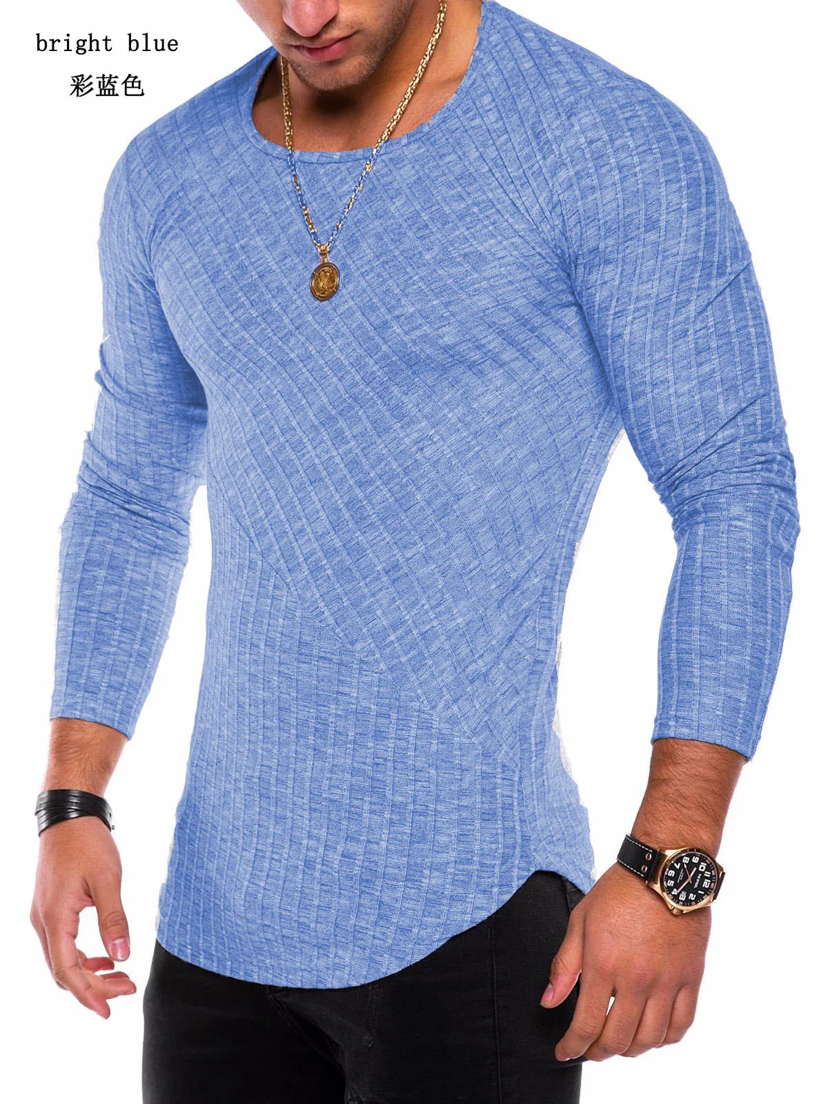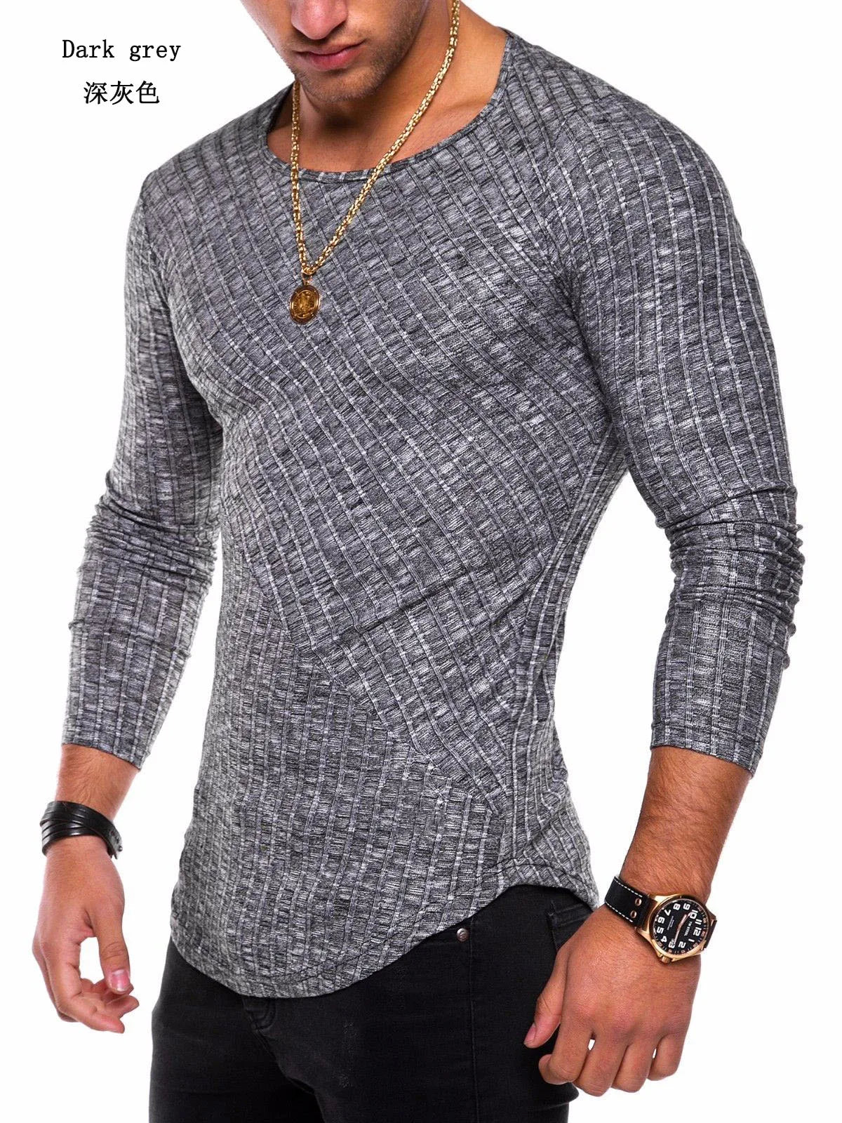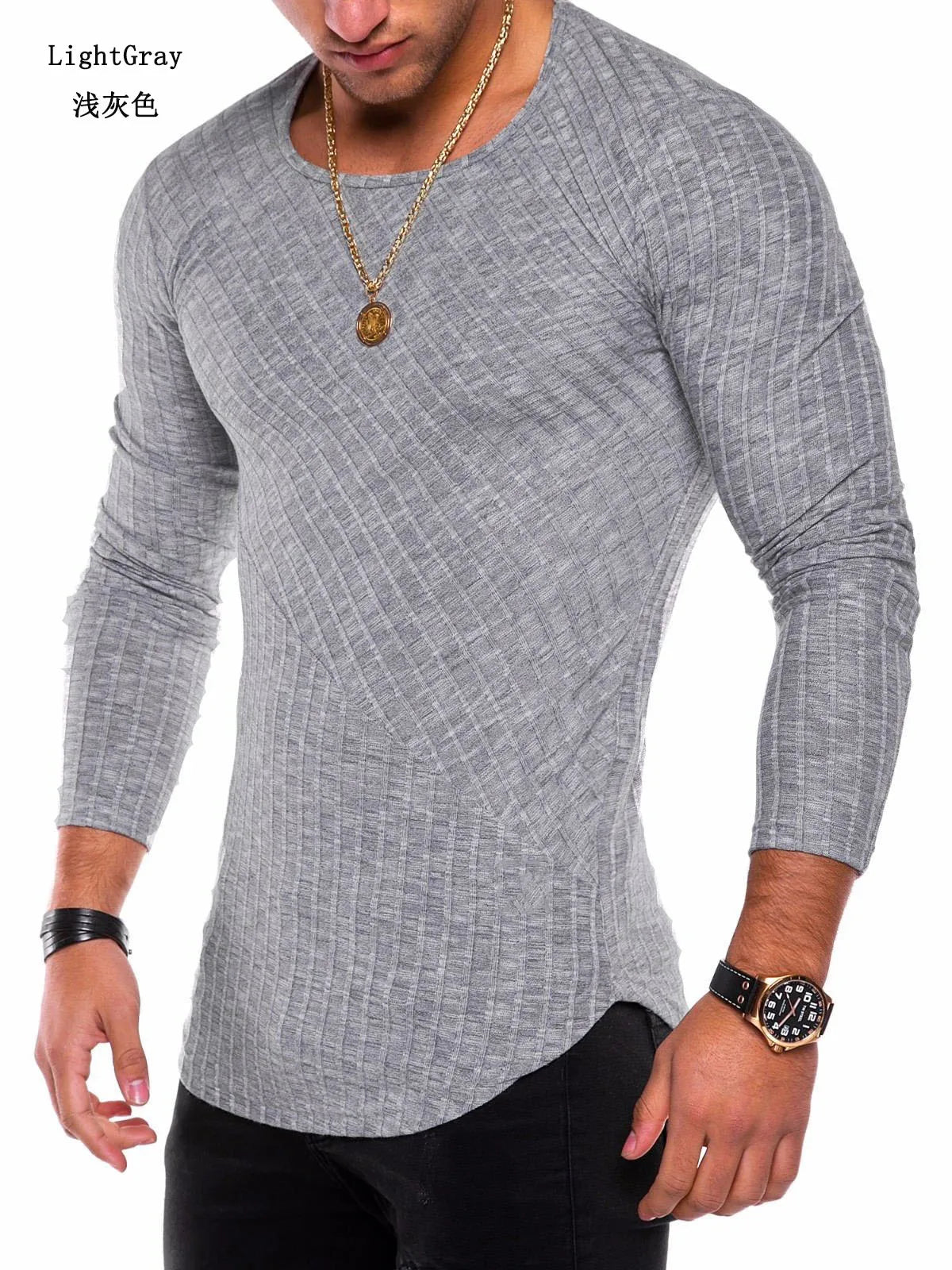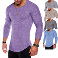 Men's Knitted Thin Base Sweater with Curved Hem Design Round Neck Tight Fit Elastic Long Sleeved T-shirt Thin Sweater