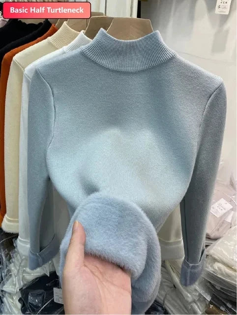 Sweater For Women Casual Thick Warm Knit Plush Velvet Lined Pullover Tops Fall Winter Soft Knitwear Jumper New Slim Poleras