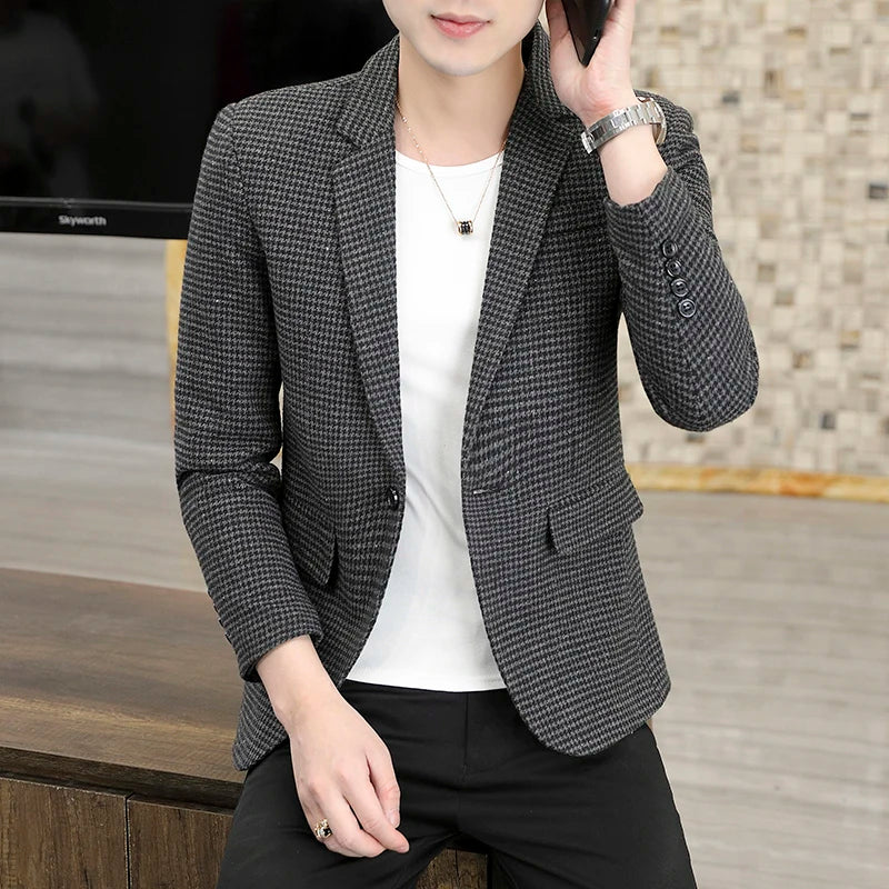 The new men's casual suit jacket for spring and autumn, a slim and stylish Korean-style checkered small suit for students, is ve