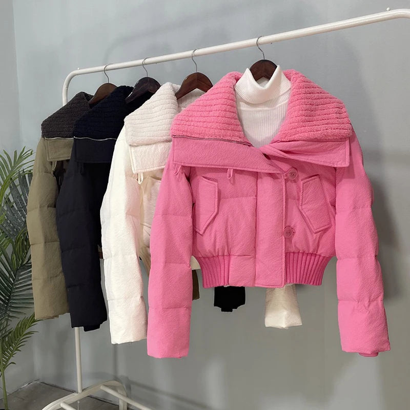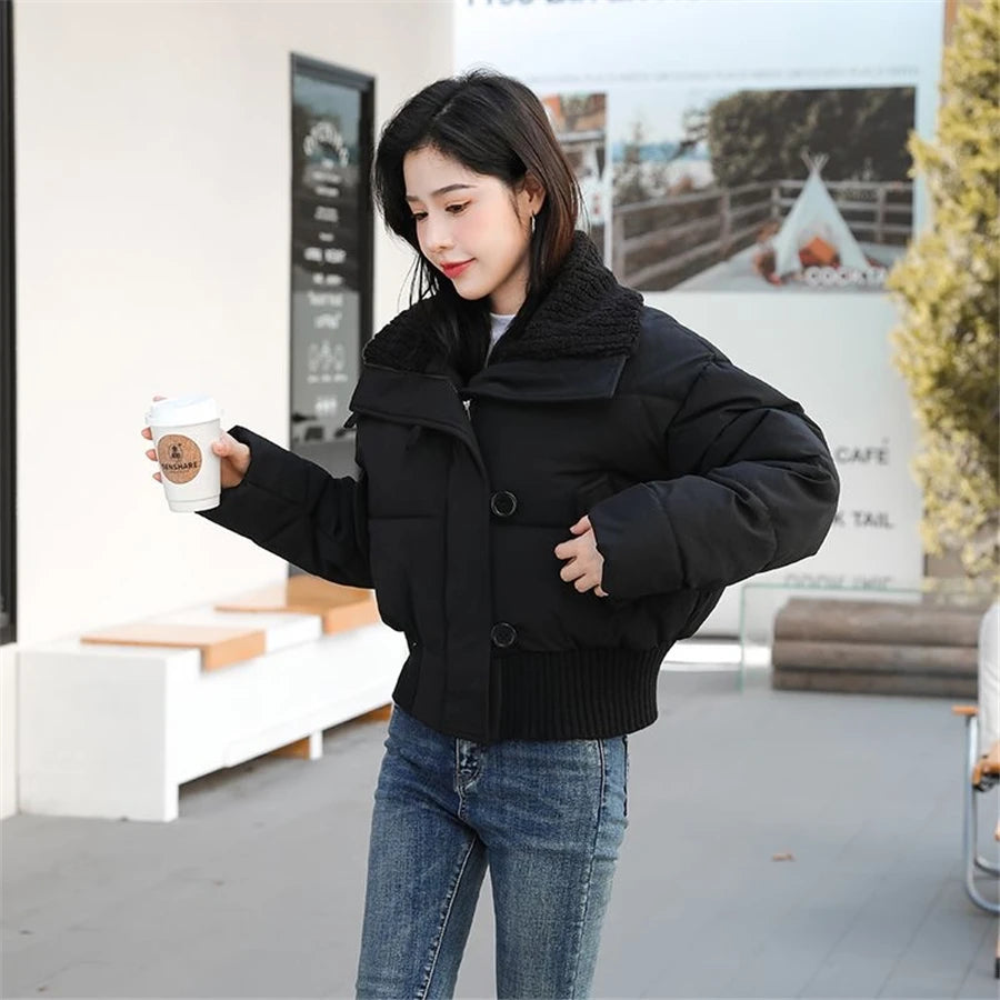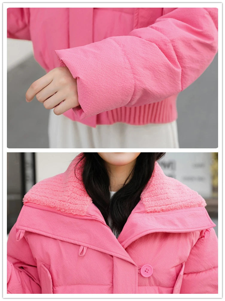 Winter Thicken Parkas Slim Short Jackets Women Korean Warm Plush Lapel Coats Casual Down Cotton Oversized Pink Crop Chaquetas