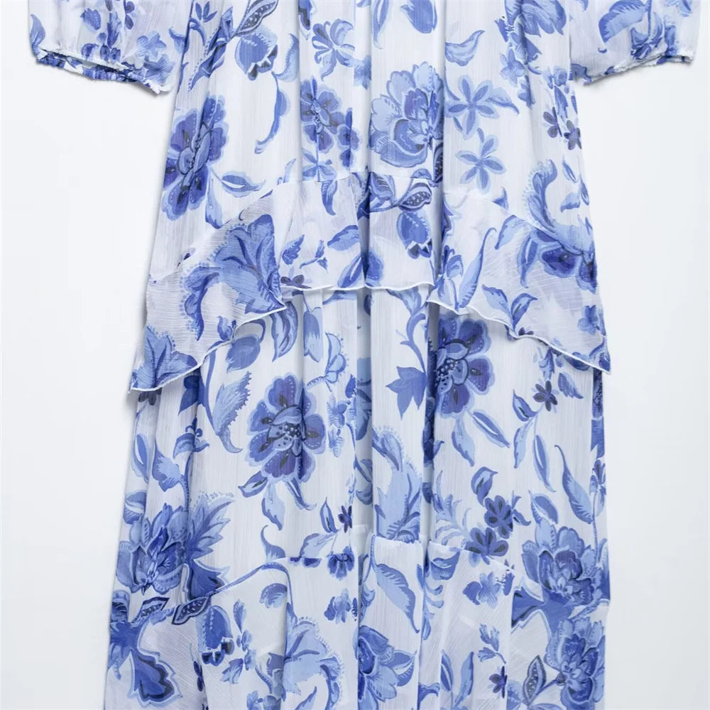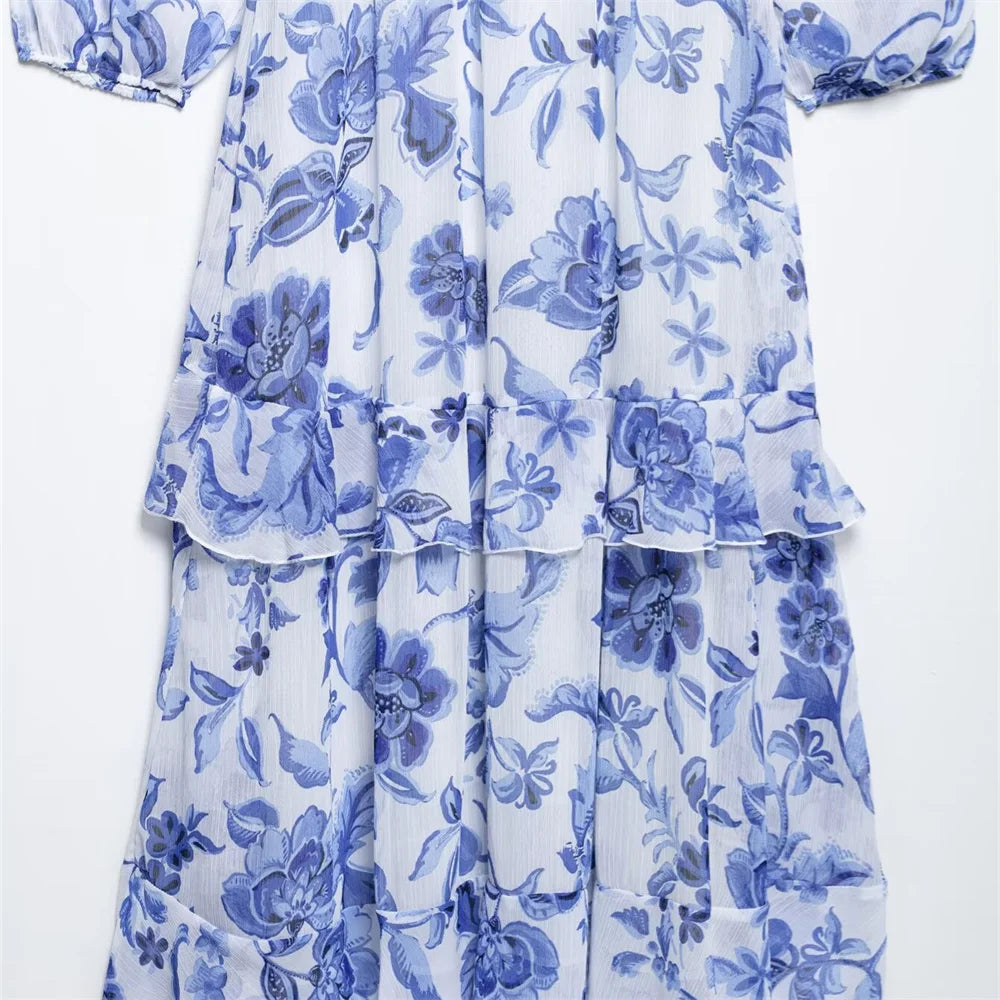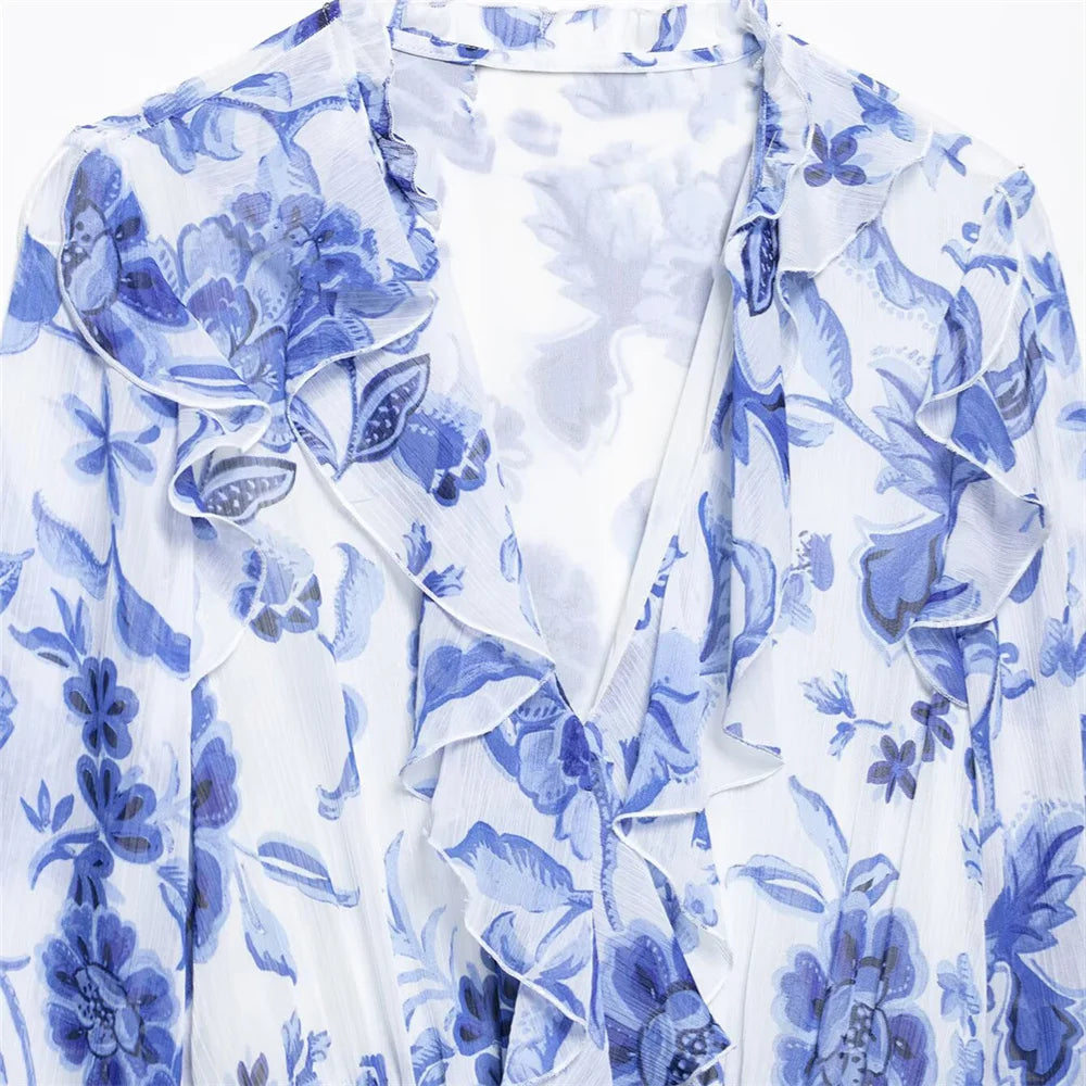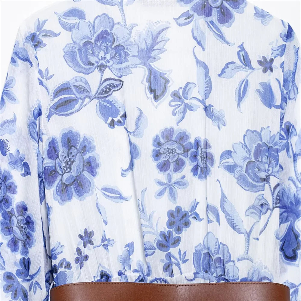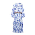 Women's Belt Printed Midi Dress V-neck Long Sleeve Ruffle Edge Spring/Summer New Women's Wear