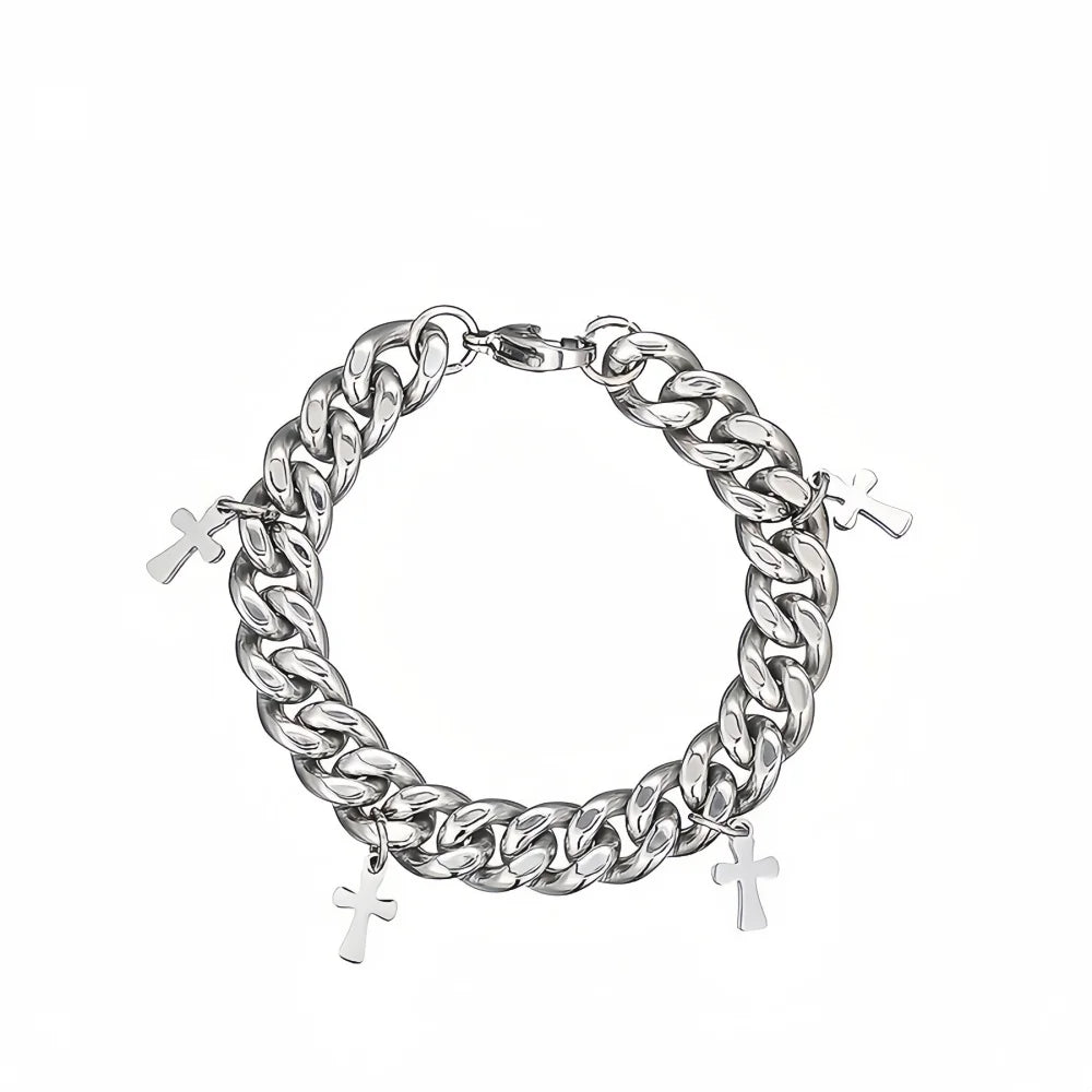 Hip Hop Raw Cuban Chain Men Bracelet Silver Color Stainless Steel Cross Tassel Bracelet Fashion Trendy Jewelry Accessories